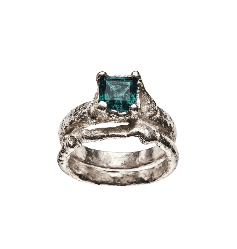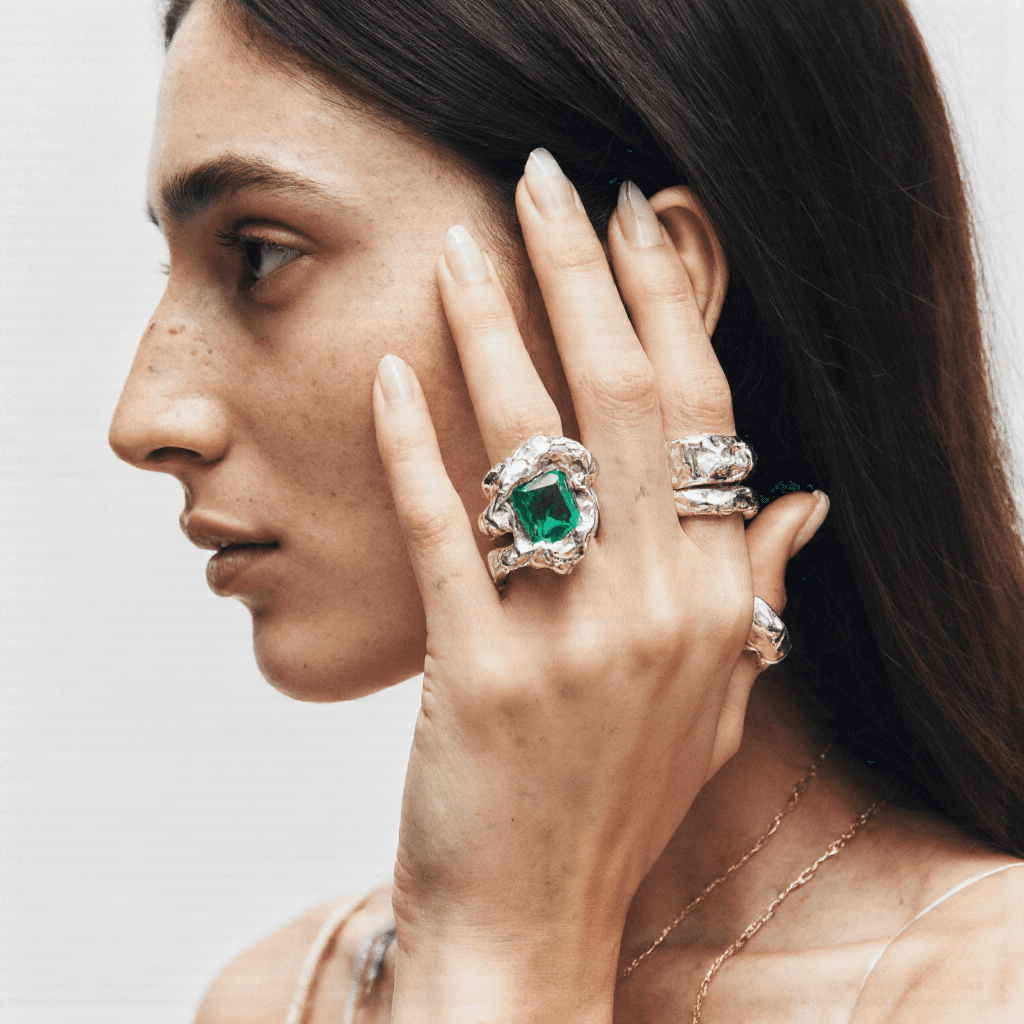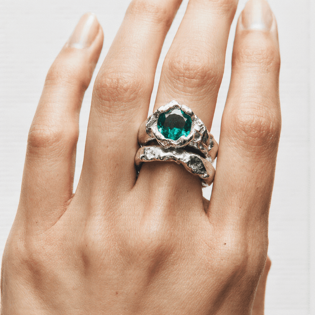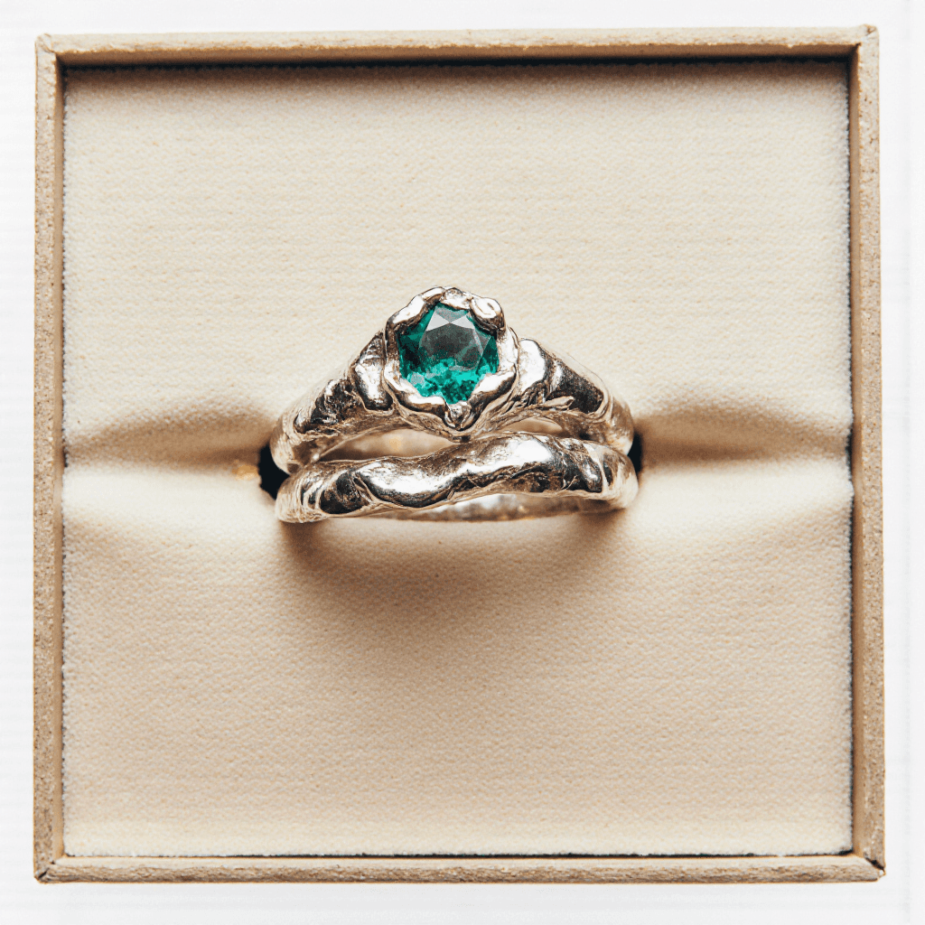 Aurora, a handcrafted ring made from recycled 925 sterling silver, adorned with a natural emerald.