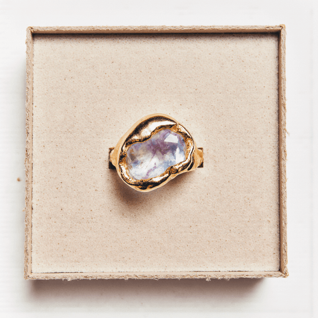 Bianca, artisanal ring made of recycled 925 sterling silver, gold-plated, with a natural moonstone.