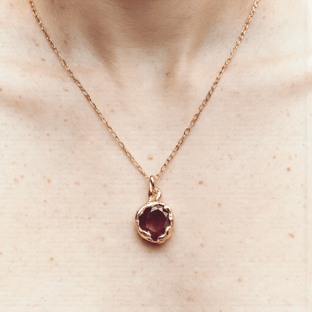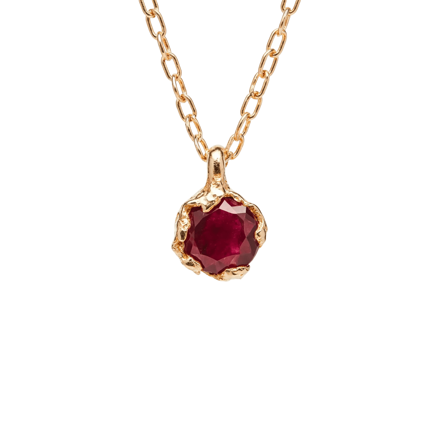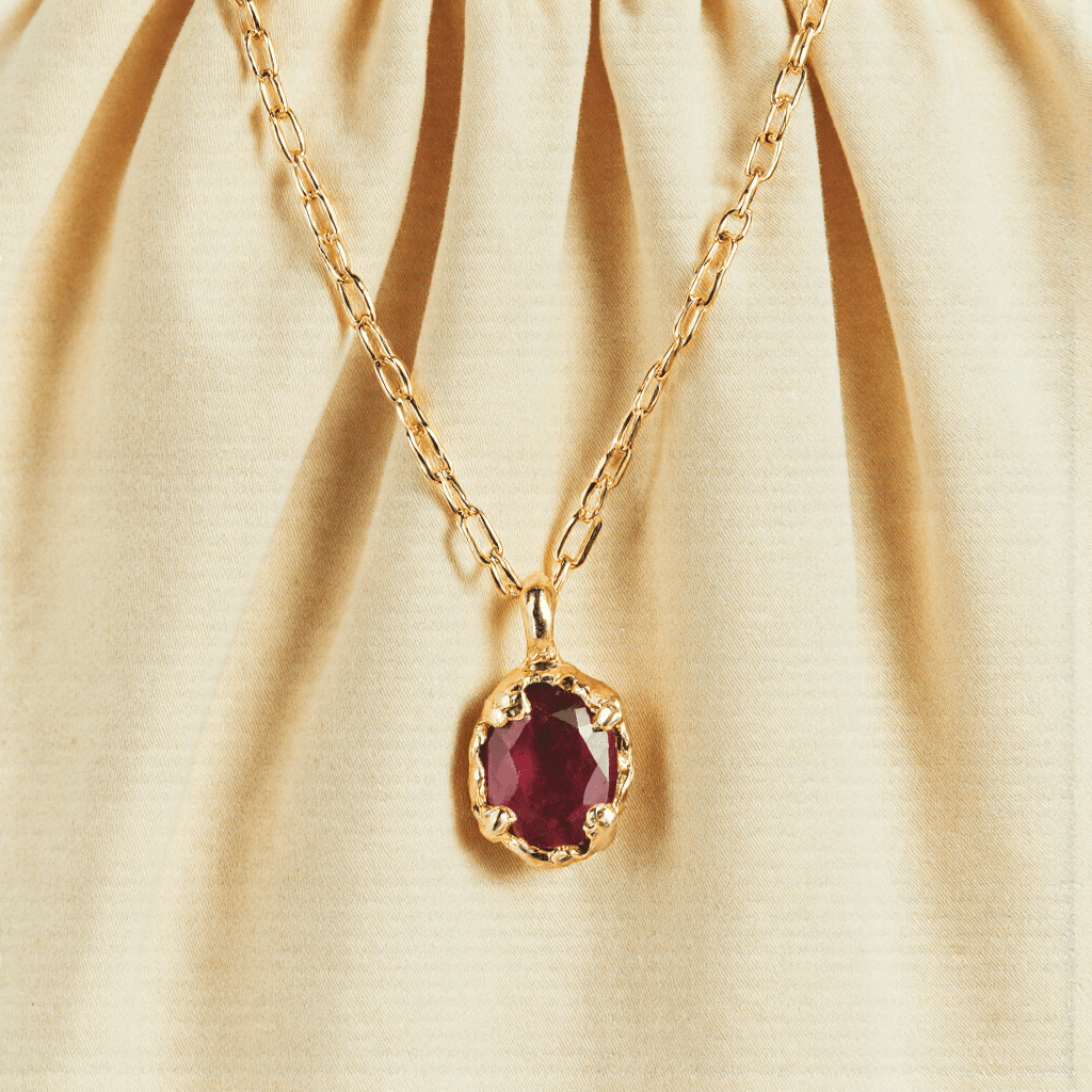 Helena, a handcrafted gold-plated pendant set with a natural ruby.