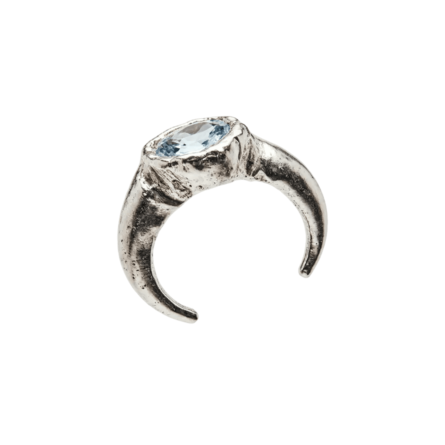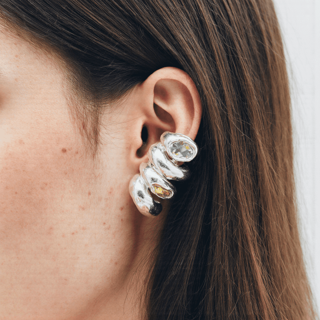 Naia, a handcrafted ear cuff made from recycled 925 sterling silver and set with a natural blue topaz. This piece is sold individually.