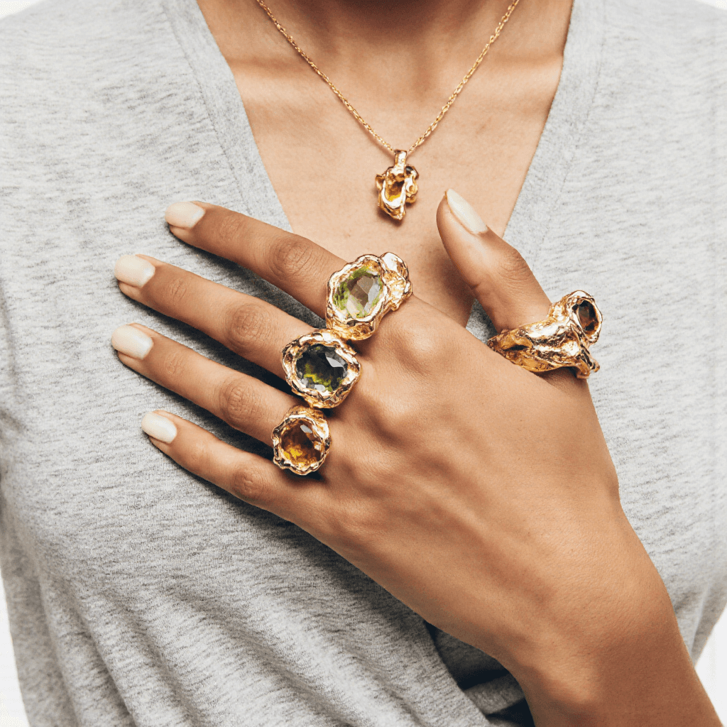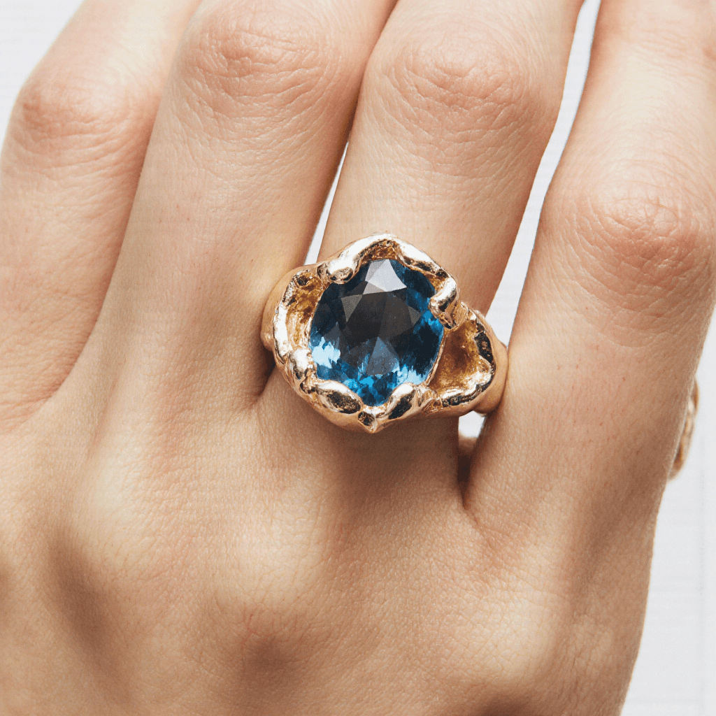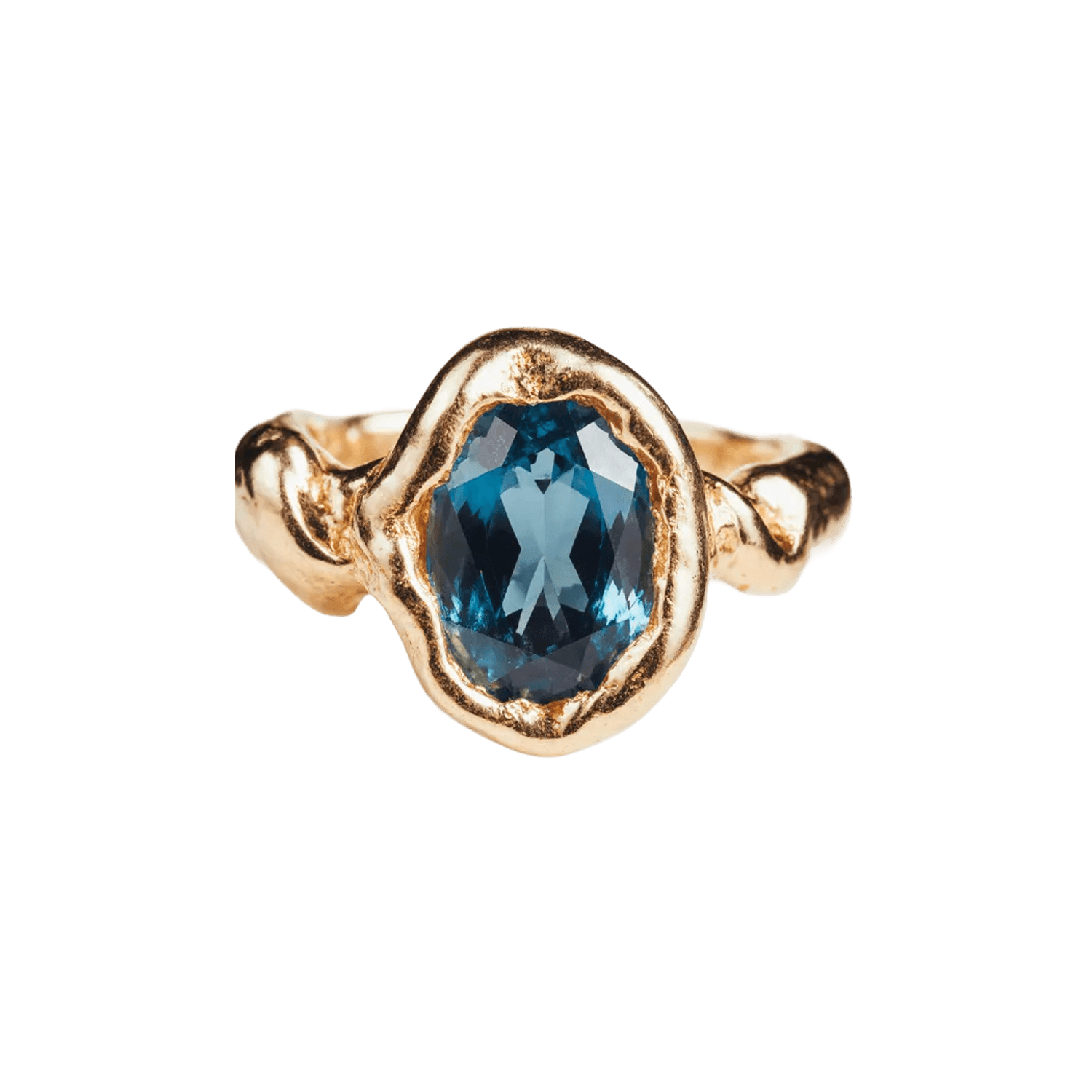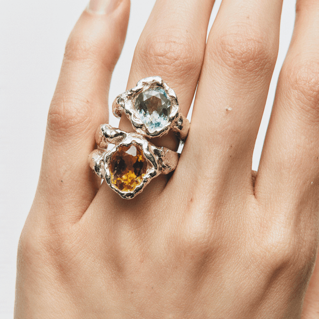 Marina, a handcrafted ring made from recycled 925 sterling silver, dipped in gold and set with a CZ topaz.